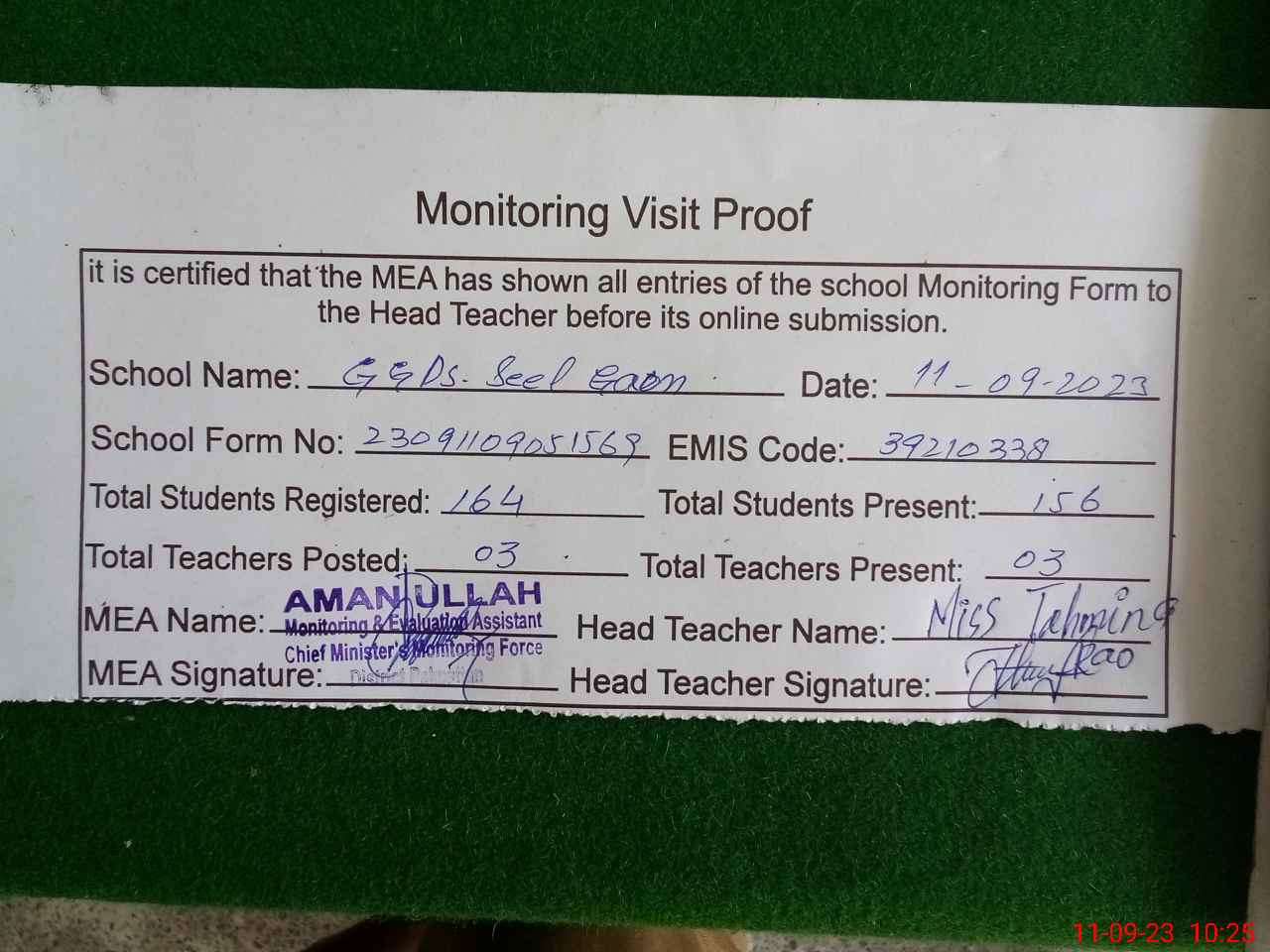 | Attendance Register | Head Teacher | MEA with School | Visit Proof |