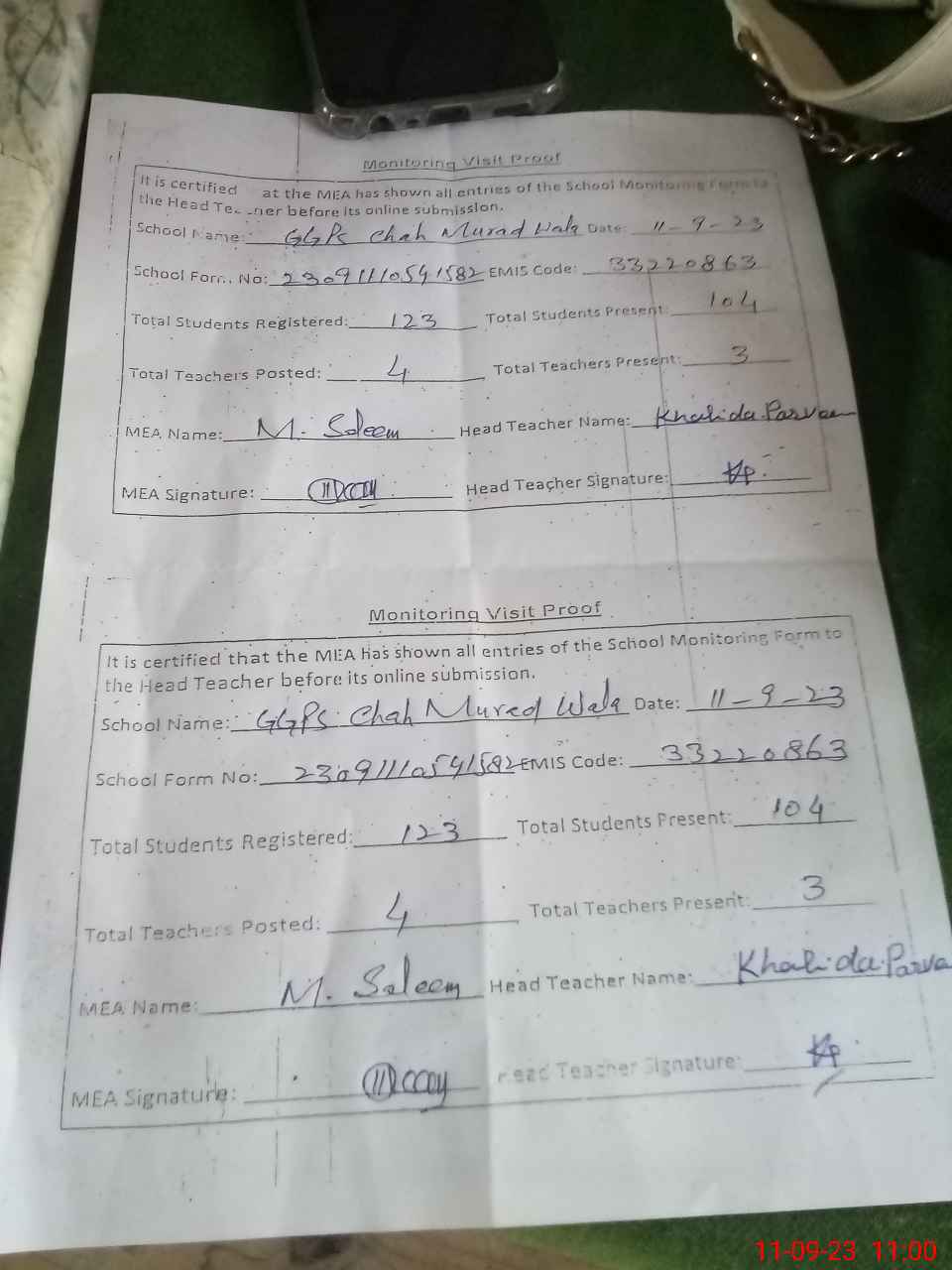 | Attendance Register | Head Teacher | MEA with School | Visit Proof |