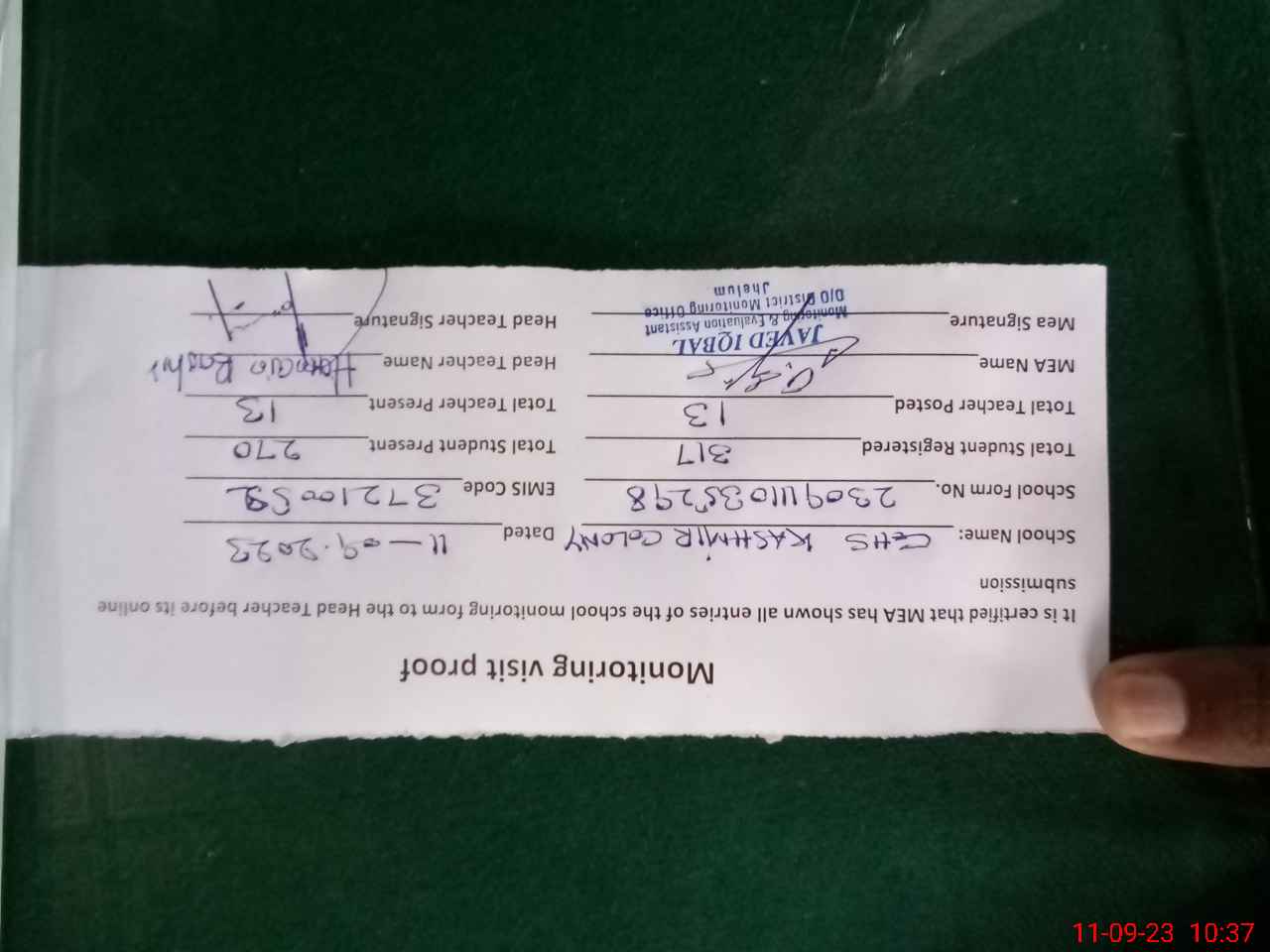 | EMIS Code: 37210052 | Name of School: GHS KASHMIR COLONY JHELUM | |||