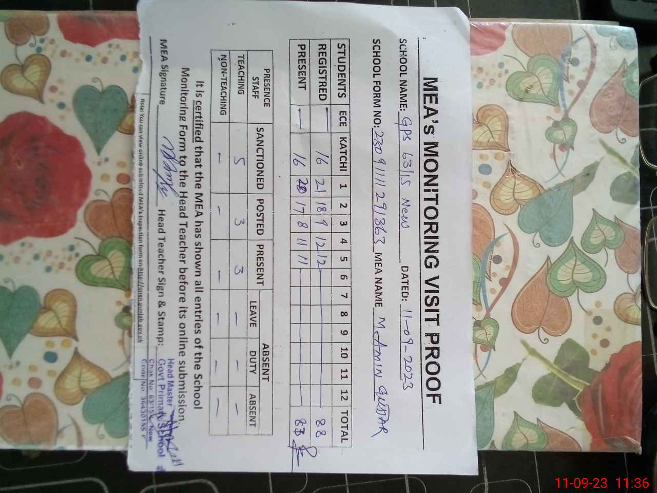 | Attendance Register | Head Teacher | MEA with School | Visit Proof |