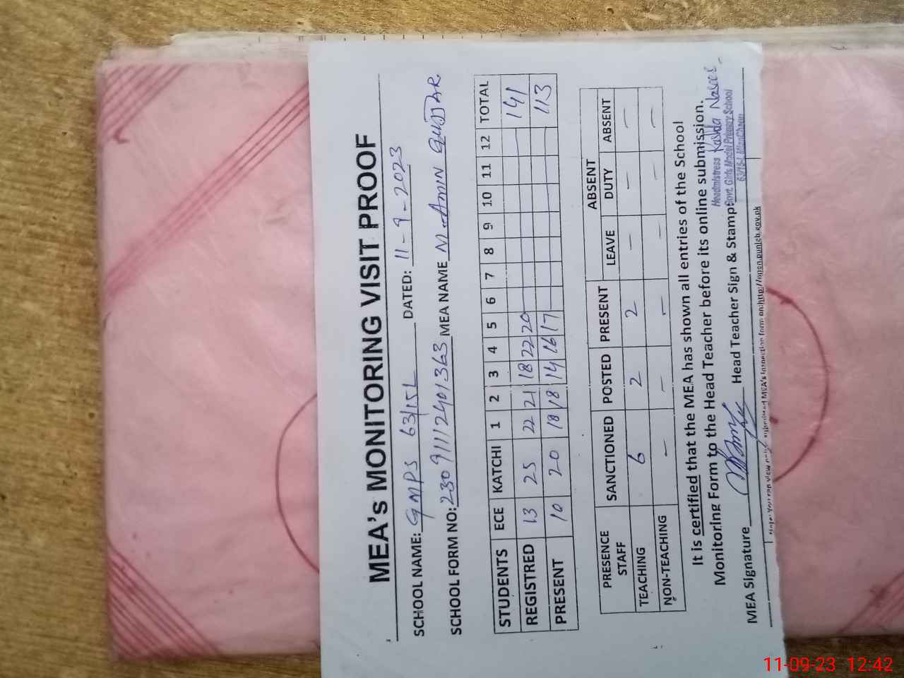 | Attendance Register | Head Teacher | MEA with School | Visit Proof |