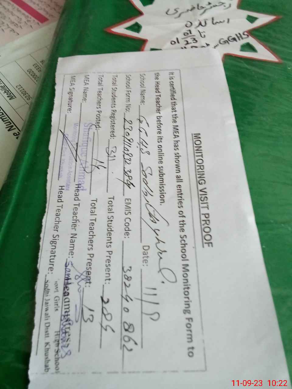 | Certified that this School was Inspected by the Undersigned MEA/DMO Today and the Information Stated Above is as Per Record. | |||||