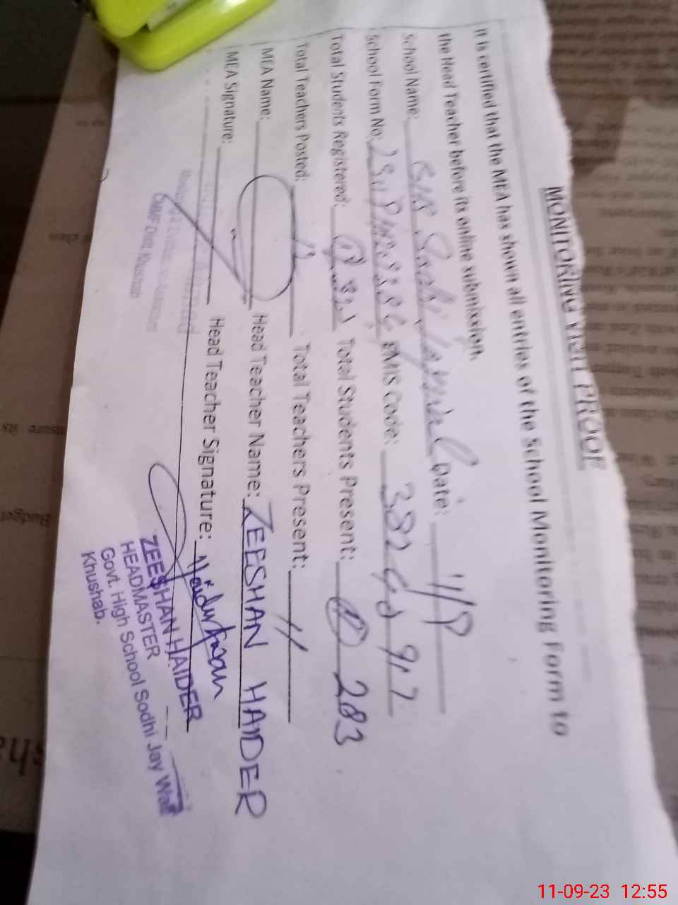 | Name: Ze**** Ha**** Designation: (School Headmaster's/Headmistress's) Sse Phone/Cell Number: 03**** |