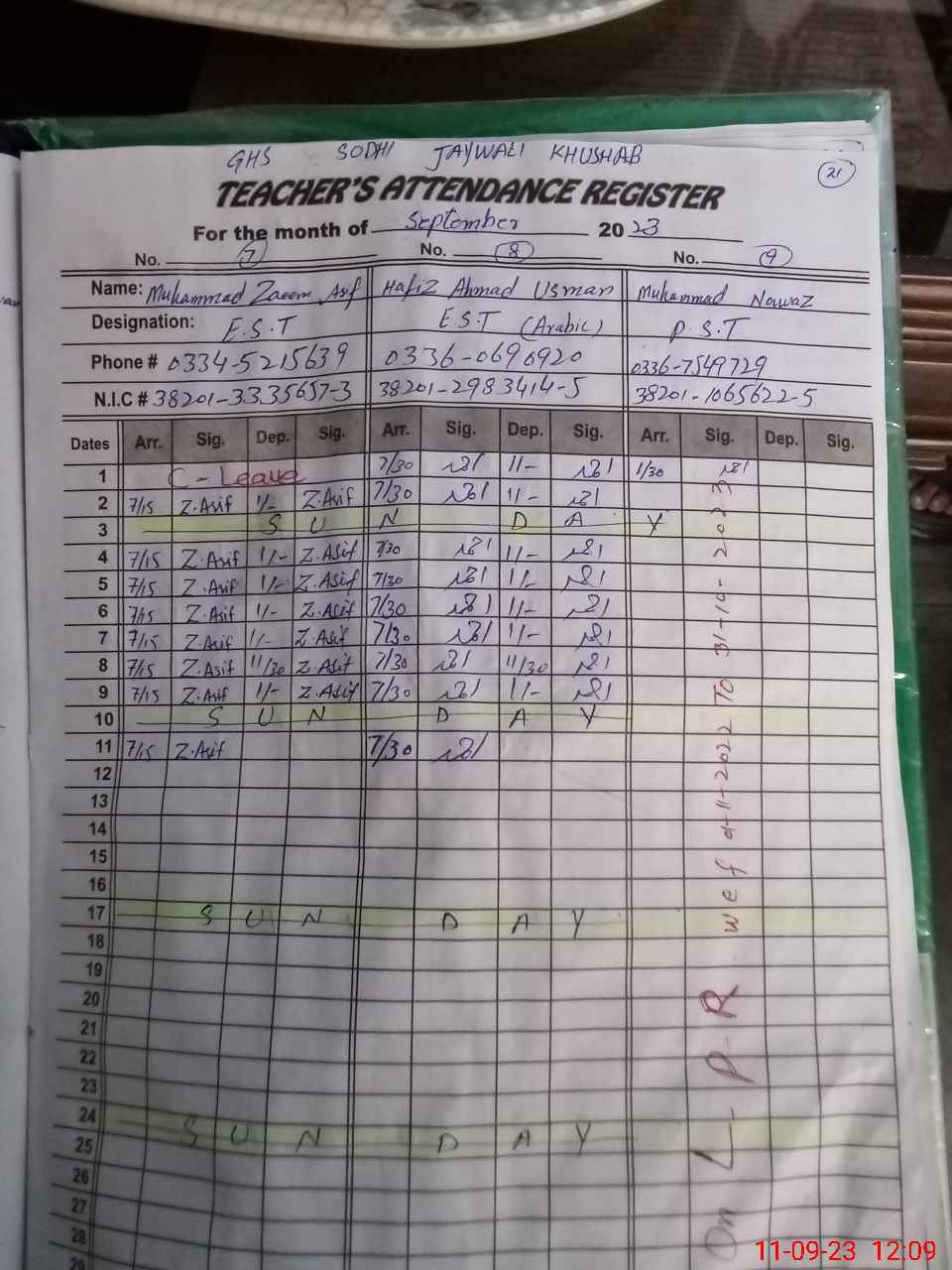 | CNIC | Full Name | Designation | R/C | Absence during last cal. month |