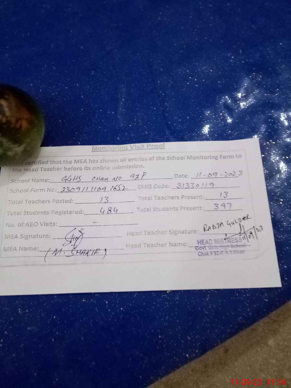 | Monitoring Date: 11-09-2023 | Start Time: 11-09-2023 09:55 AM | End Time: 11-09-2023 11:16 AM | Name of MEA: Mu**** Sh**** | |