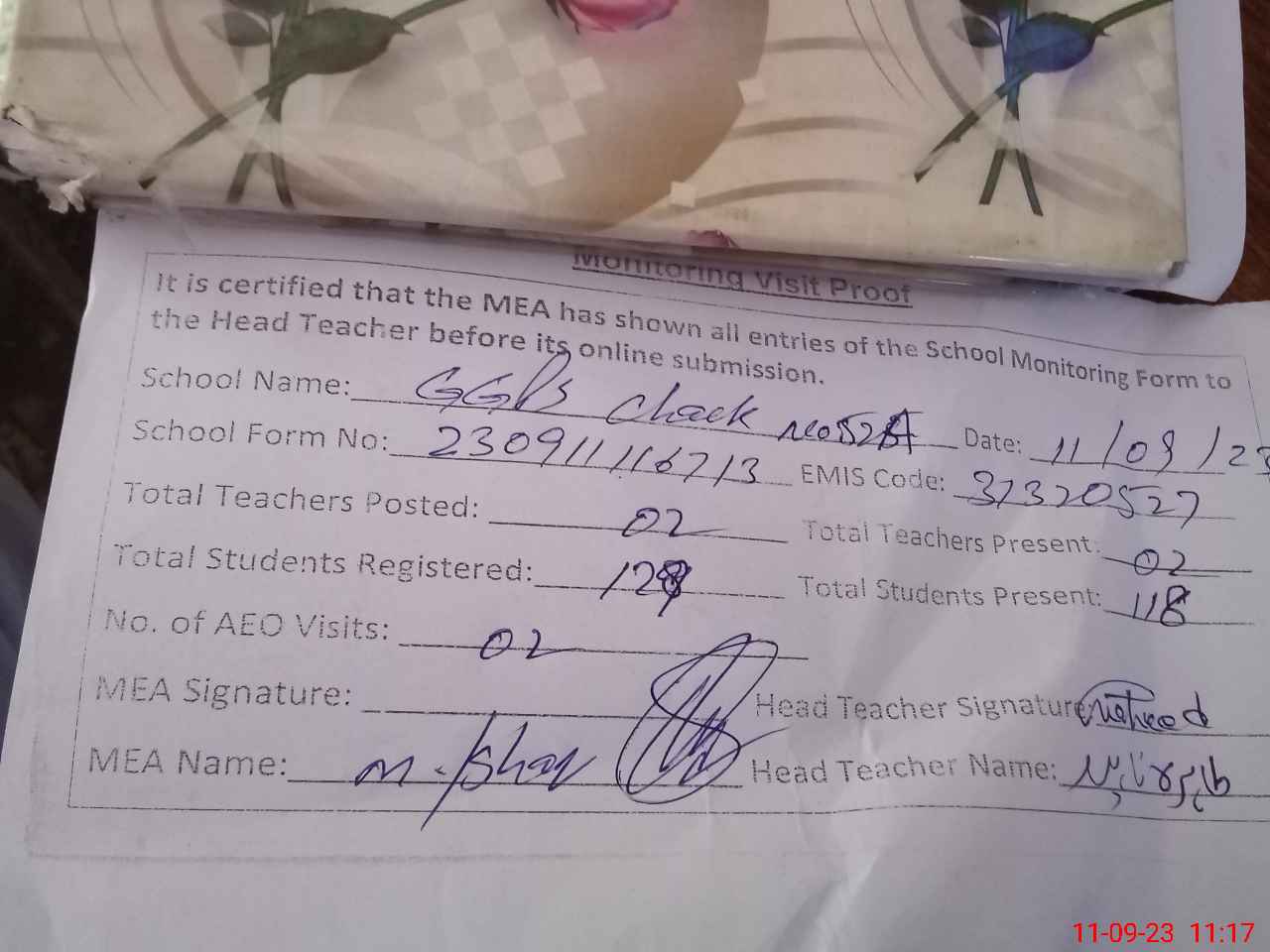 | Attendance Register | Head Teacher | MEA with School | Visit Proof |