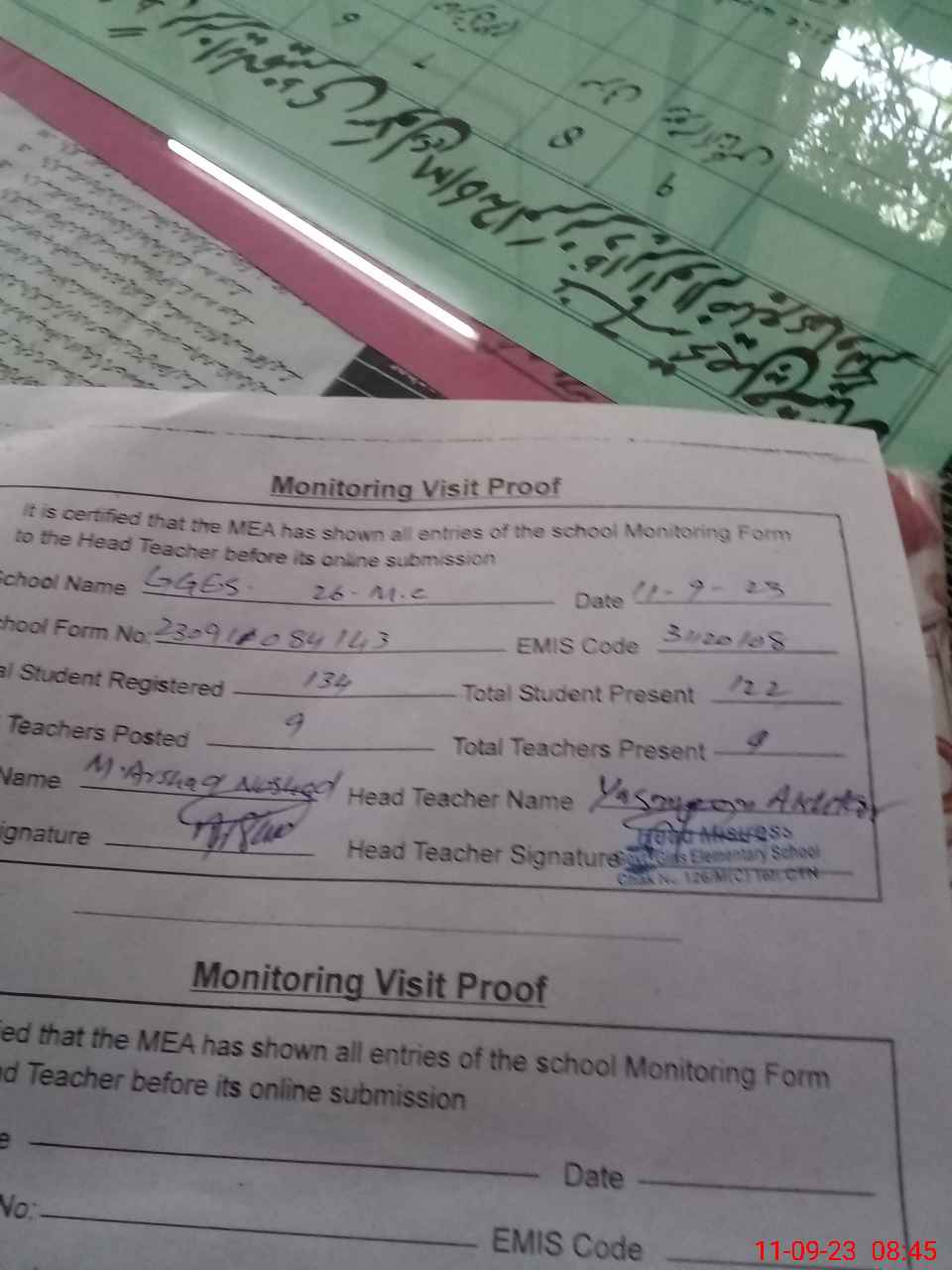 | Attendance Register | Head Teacher | MEA with School | Visit Proof |