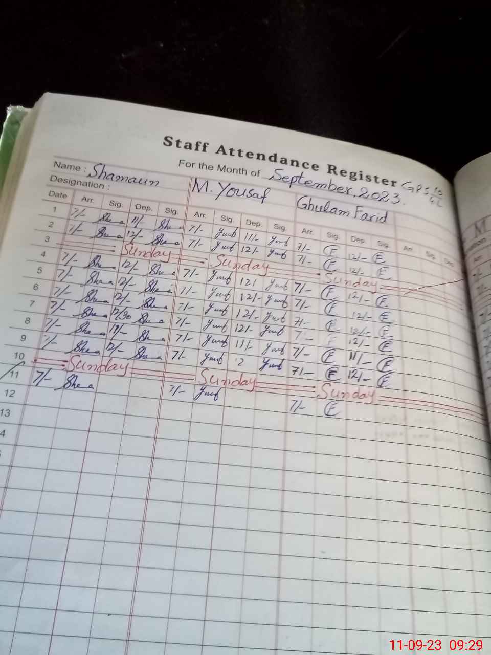 | Monitoring Date: 11-09-2023 | Start Time: 11-09-2023 09:28 AM | End Time: 11-09-2023 09:49 AM | Name of MEA: MA**** AH**** | |