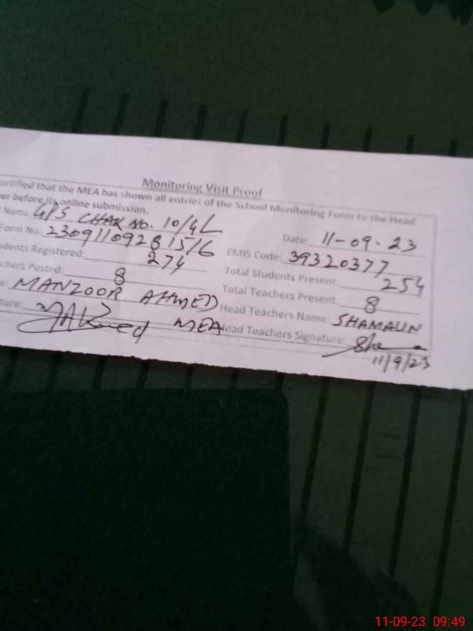 | Attendance Register | Head Teacher | MEA with School | Visit Proof |