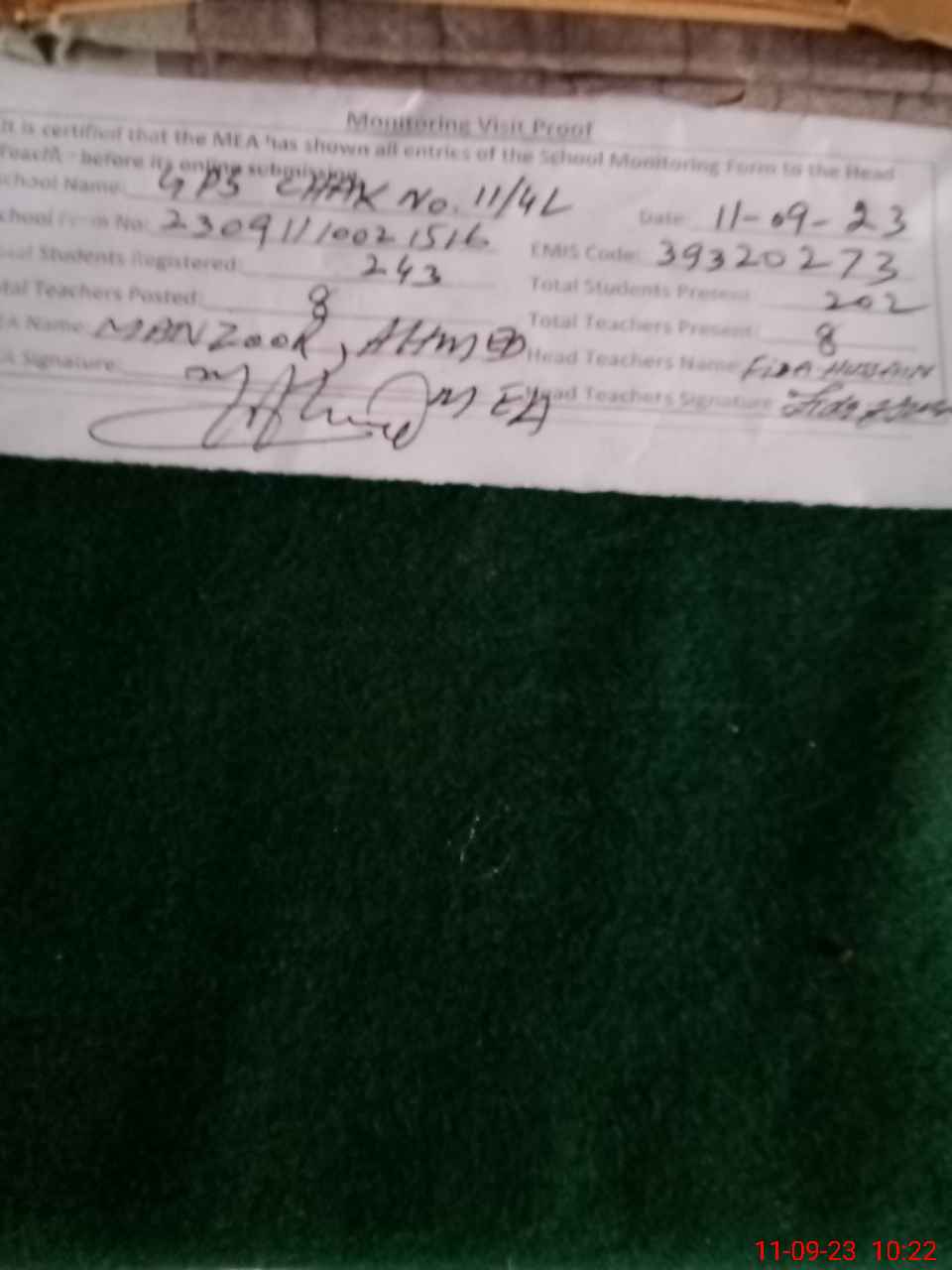 | Name: FI**** HU**** Designation: (School Headmaster's/Headmistress's) PST H MASTER Phone/Cell Number: 03**** |