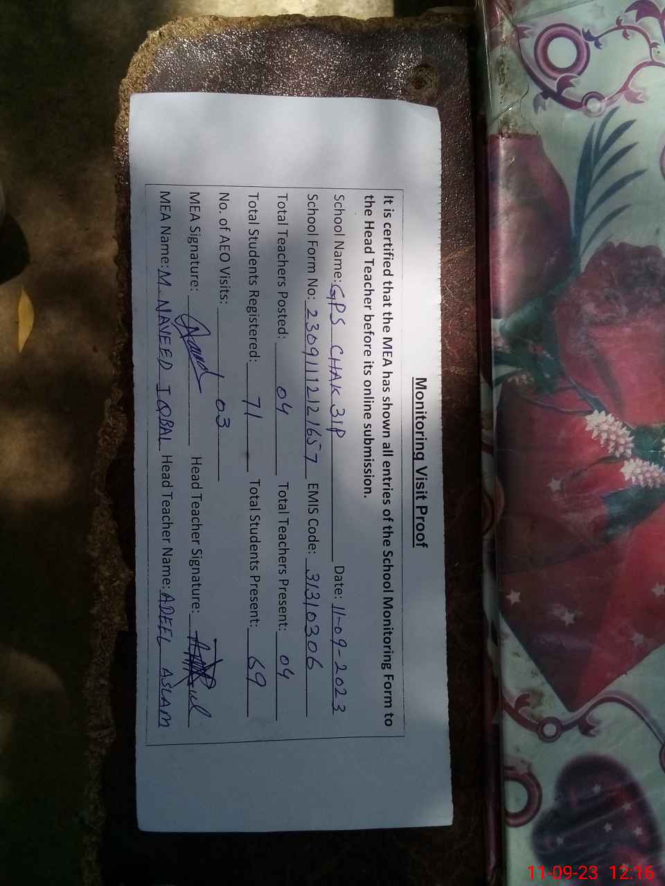 | Attendance Register | Head Teacher | MEA with School | Visit Proof |