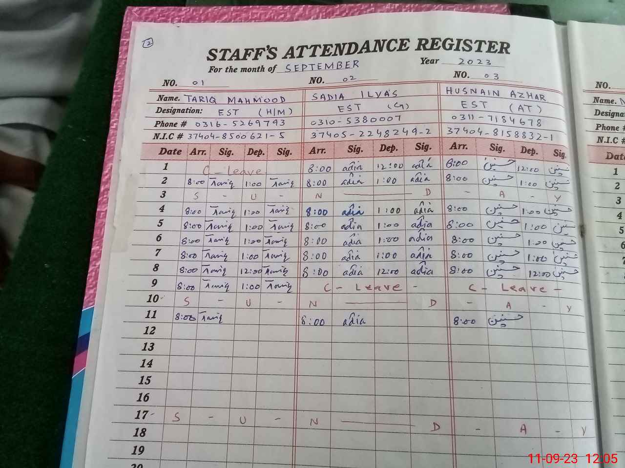 | CNIC | Full Name | Designation | R/C | Absence during last cal. month |