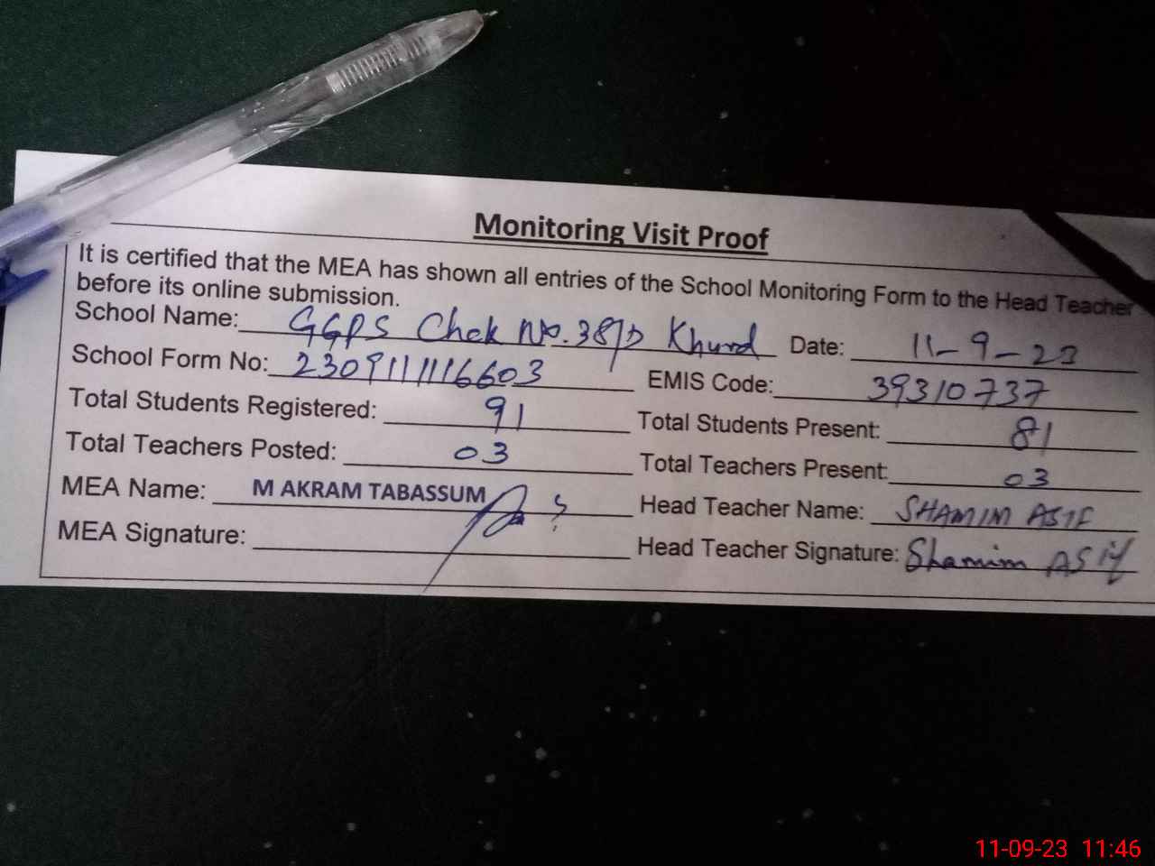 | Attendance Register | Head Teacher | MEA with School | Visit Proof |