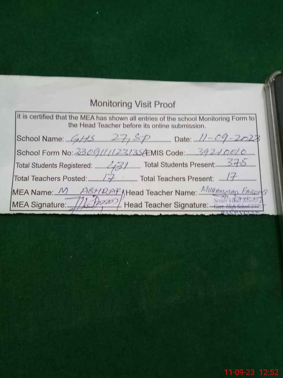 | EMIS Code: 39210010 | Name of School: GHS 27 SP | |||