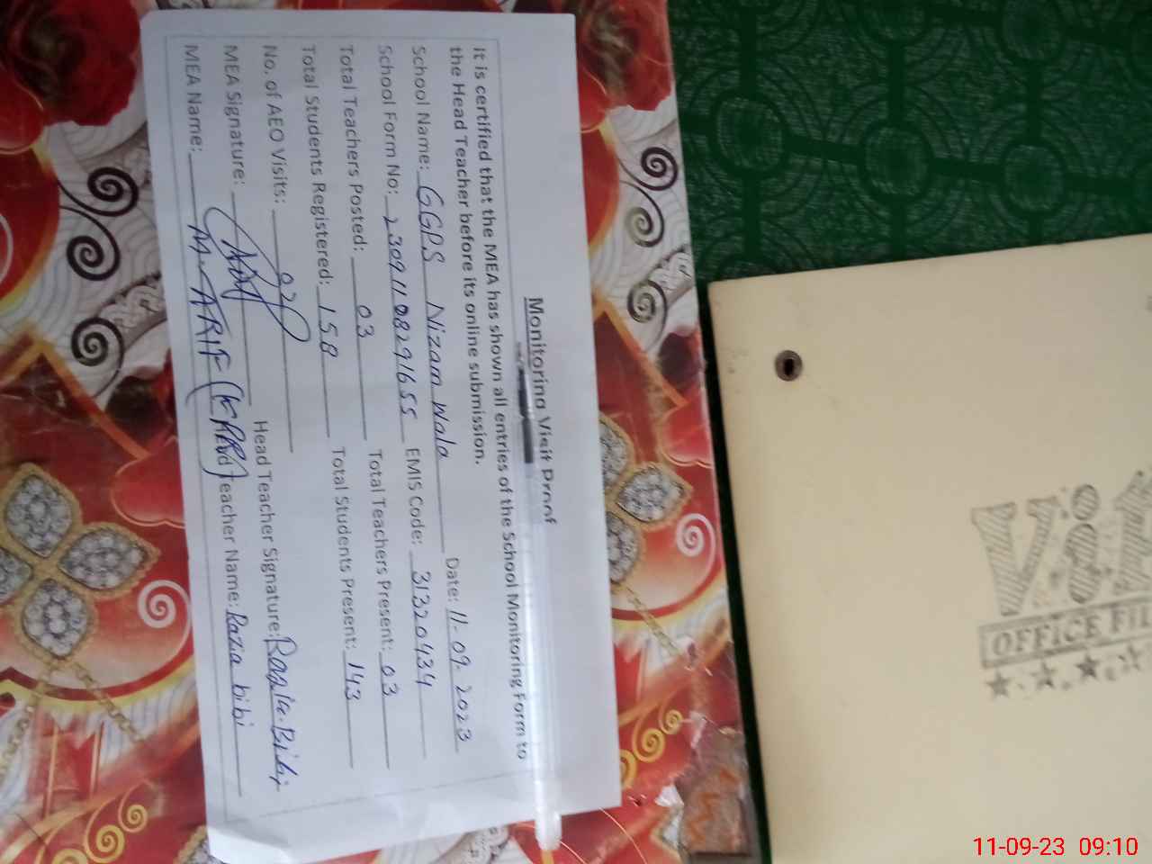 | Attendance Register | Head Teacher | MEA with School | Visit Proof |