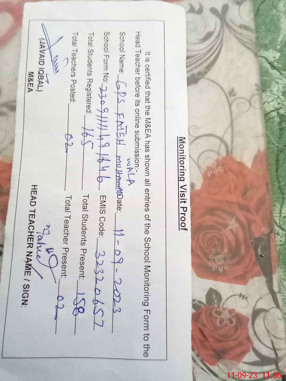 | Attendance Register | Head Teacher | MEA with School | Visit Proof |