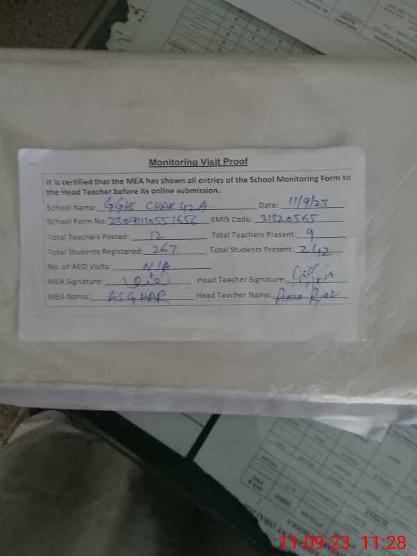 | EMIS Code: 31320565 | Name of School: GGHS CHAK 42/A | |||