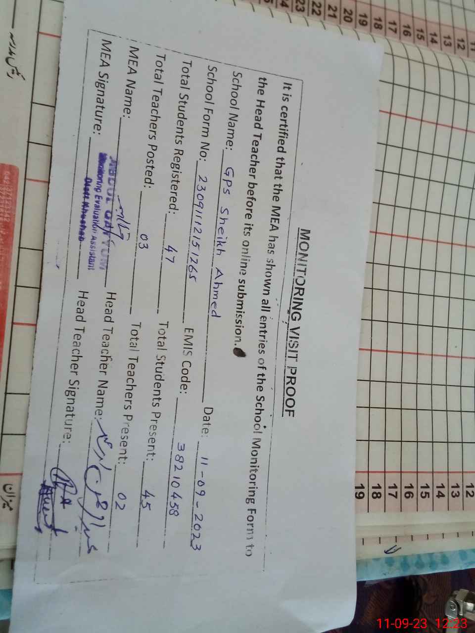 | Attendance Register | Head Teacher | MEA with School | Visit Proof |