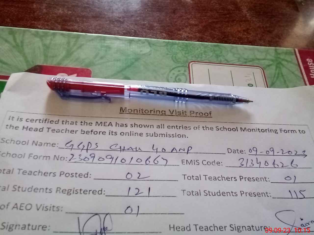 | Attendance Register | Head Teacher | MEA with School | Visit Proof |