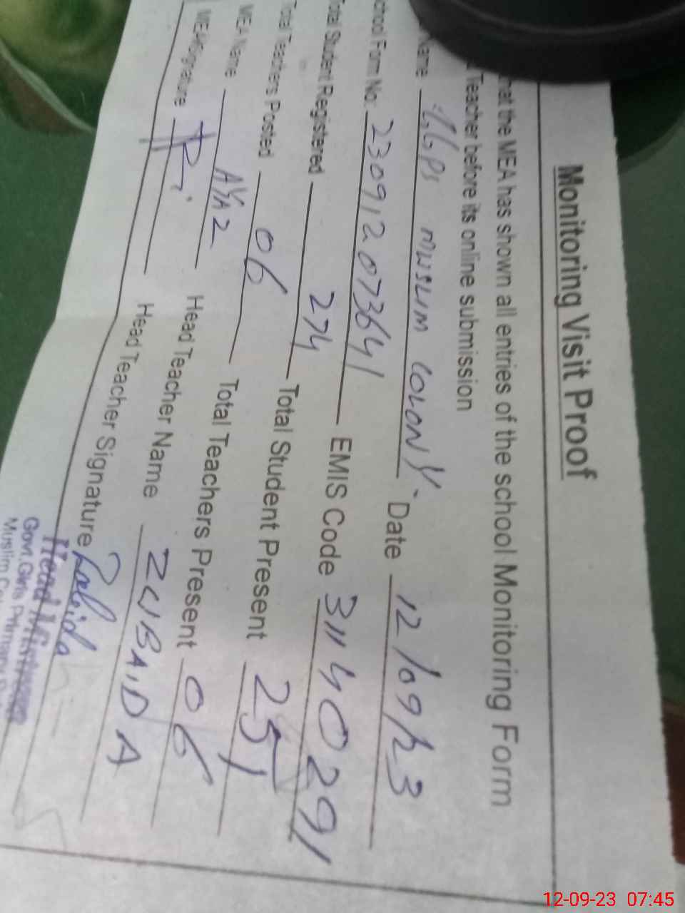 | Attendance Register | Head Teacher | MEA with School | Visit Proof |
