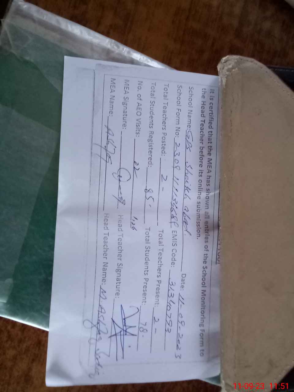 | Attendance Register | Head Teacher | MEA with School | Visit Proof |