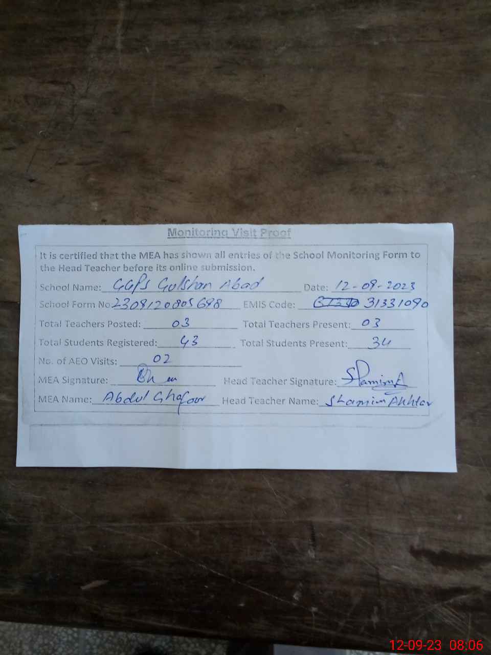 | Attendance Register | Head Teacher | MEA with School | Visit Proof |