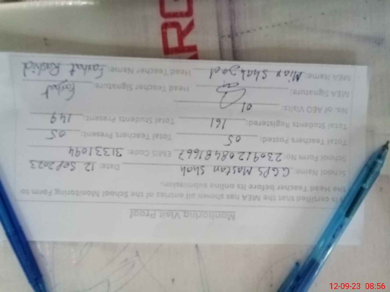| Attendance Register | Head Teacher | MEA with School | Visit Proof |