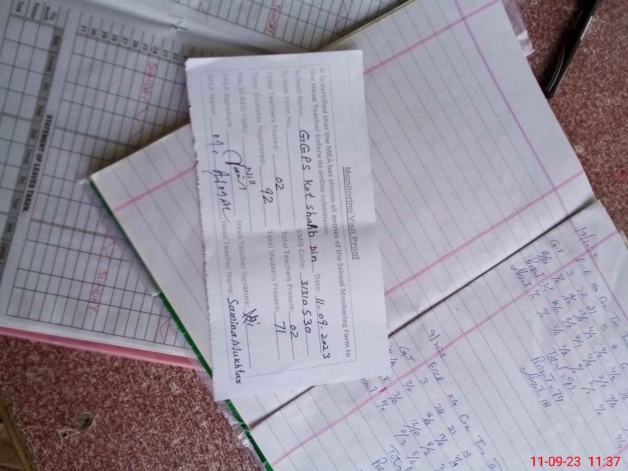 | Attendance Register | Head Teacher | MEA with School | Visit Proof |