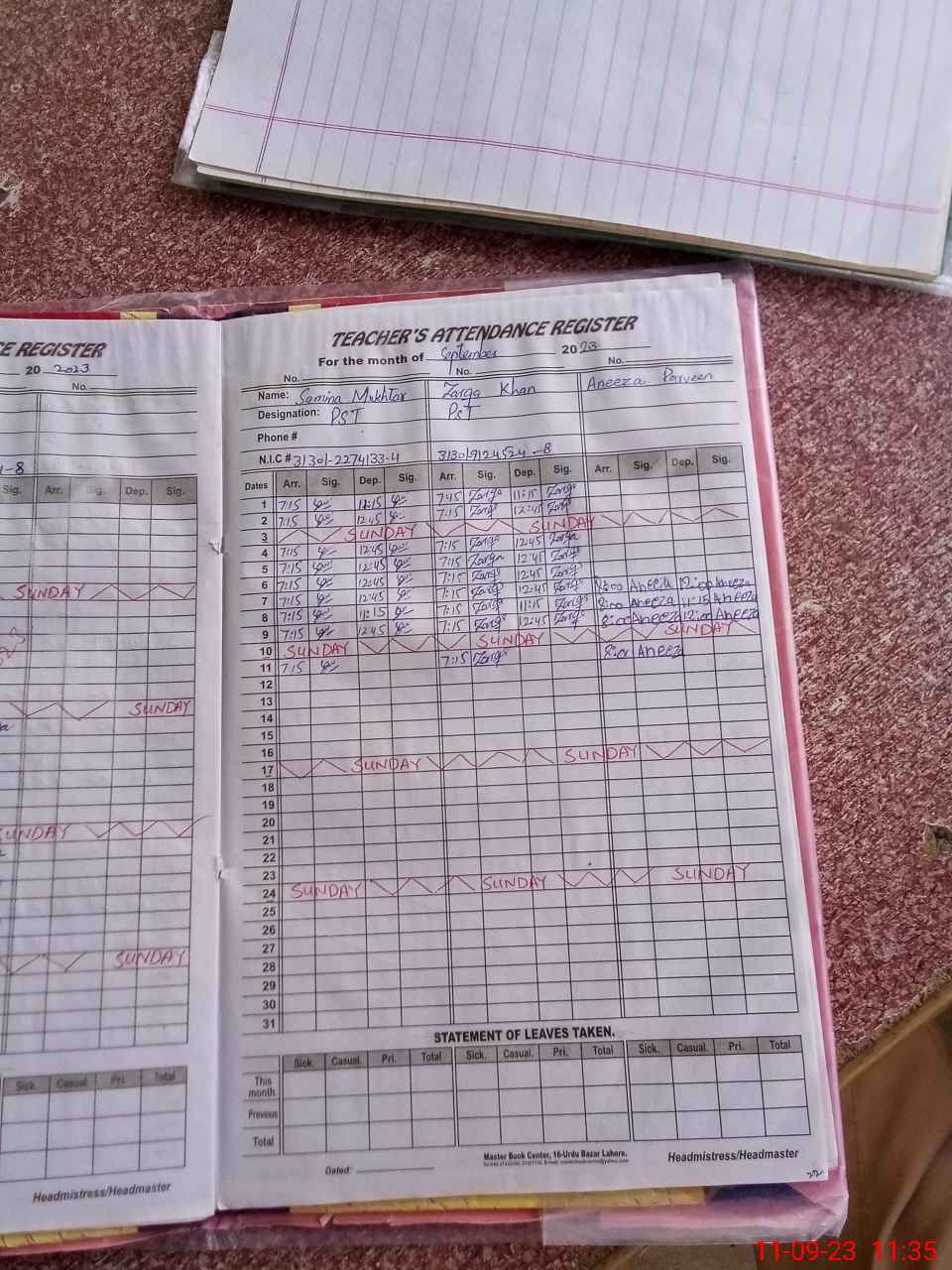 | CNIC | Full Name | Designation | R/C | Absence During Last Calender Month |