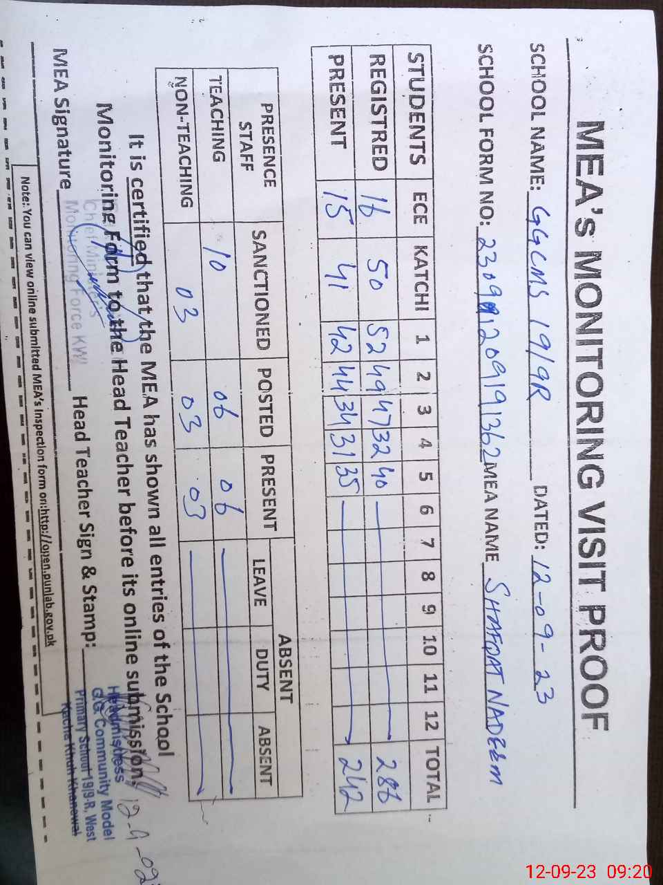 | Attendance Register | Head Teacher | MEA with School | Visit Proof |