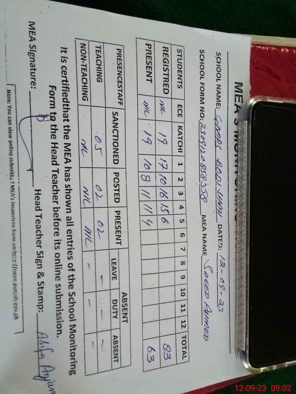 | Attendance Register | Head Teacher | MEA with School | Visit Proof |