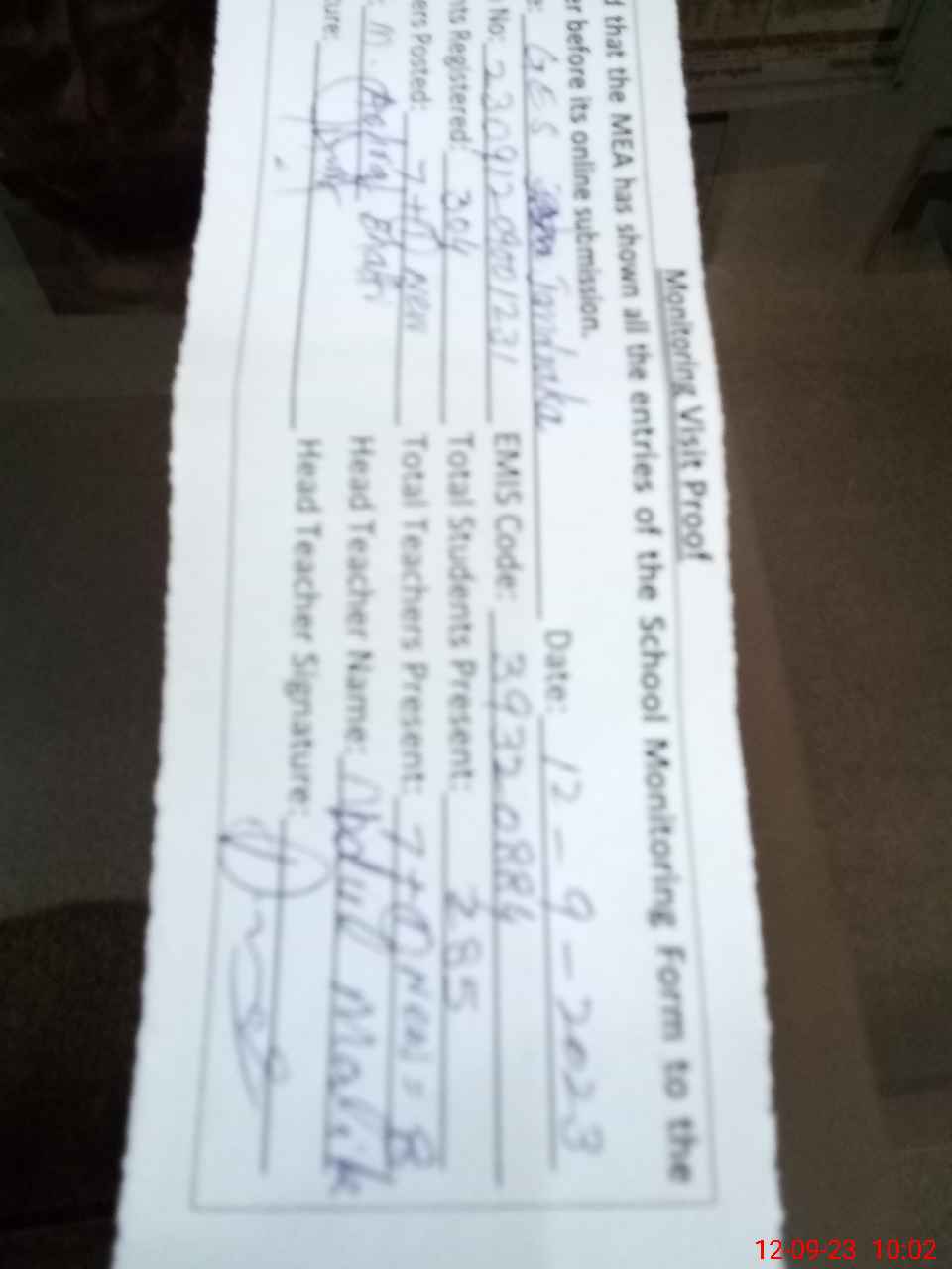 | Attendance Register | Head Teacher | MEA with School | Visit Proof |