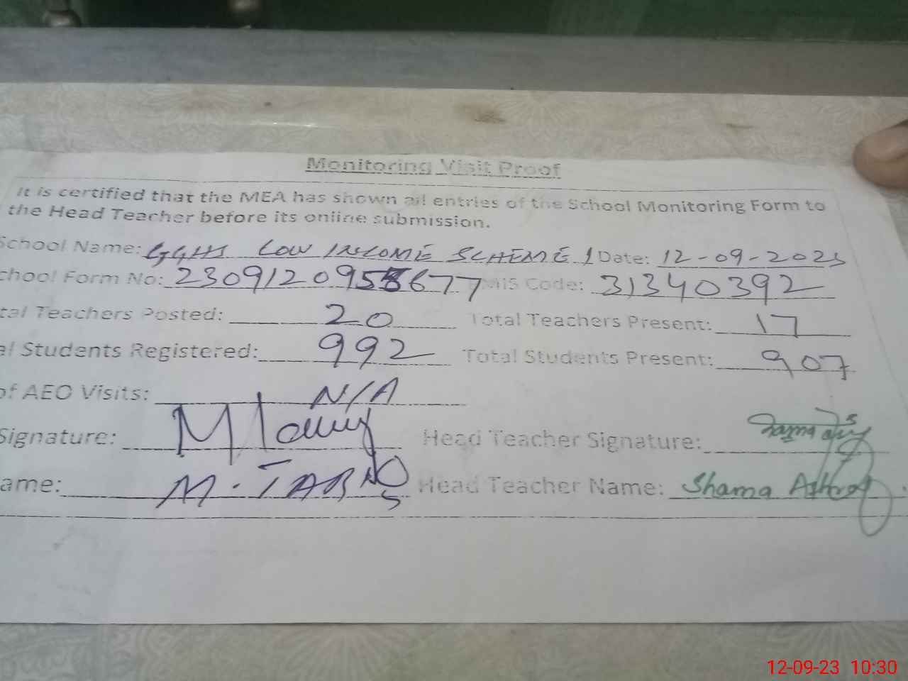 | Attendance Register | Head Teacher | MEA with School | Visit Proof |