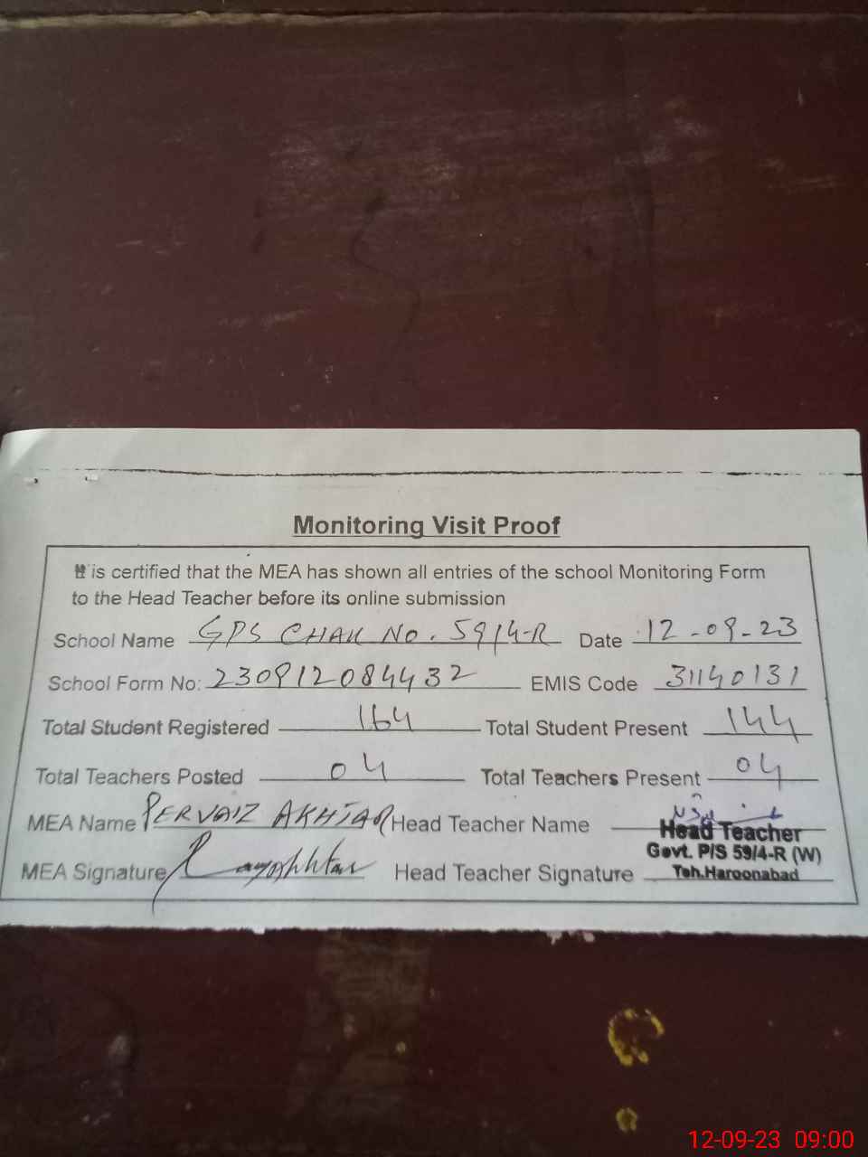 | Attendance Register | Head Teacher | MEA with School | Visit Proof |