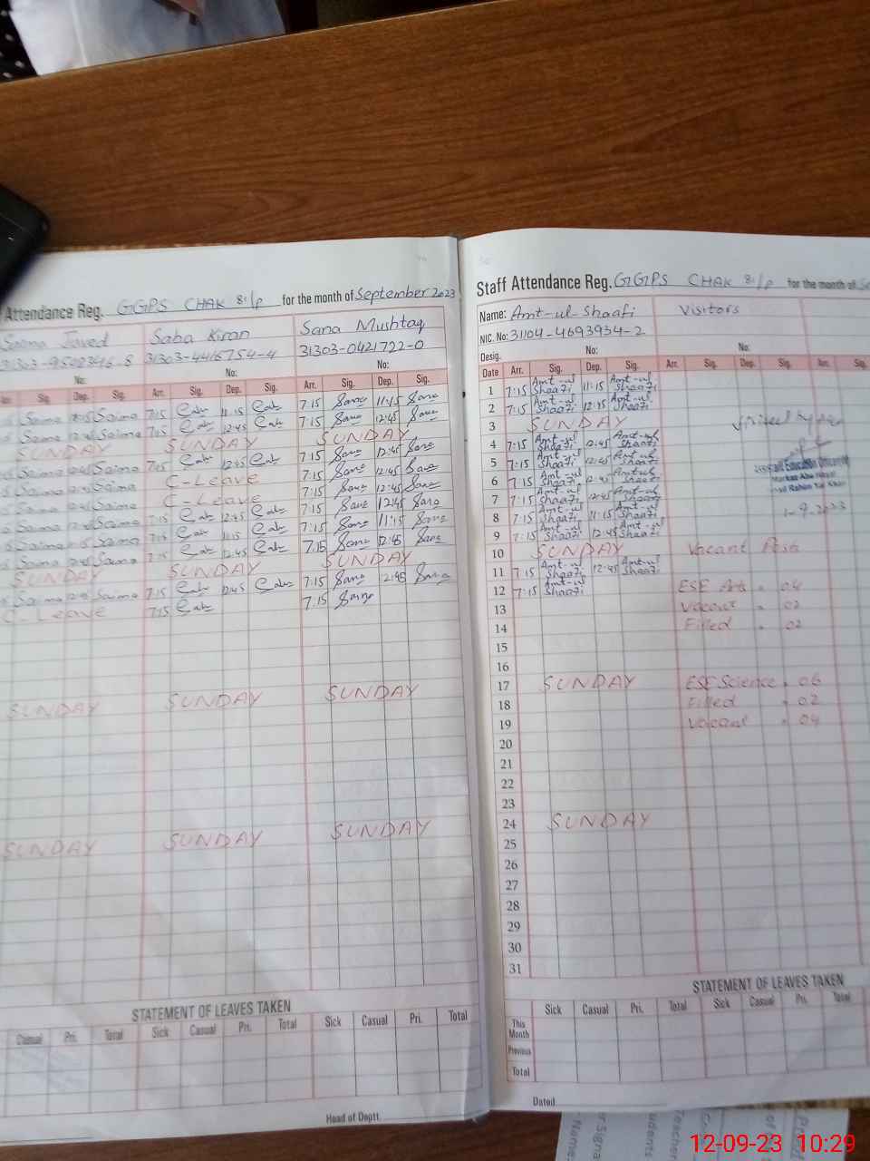 | CNIC | Full Name | Designation | R/C | Absence During Last Calender Month |