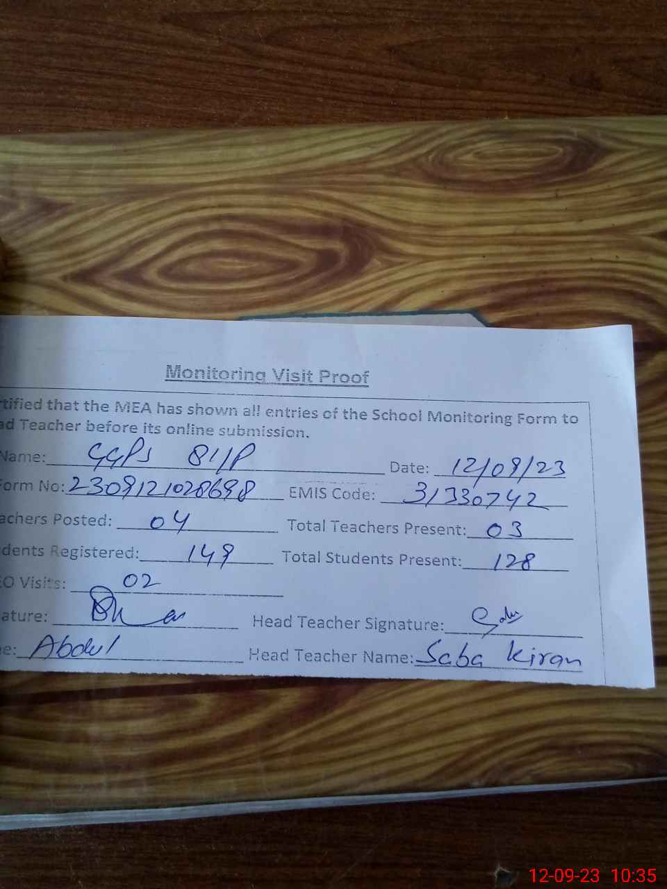 | Attendance Register | Head Teacher | MEA with School | Visit Proof |