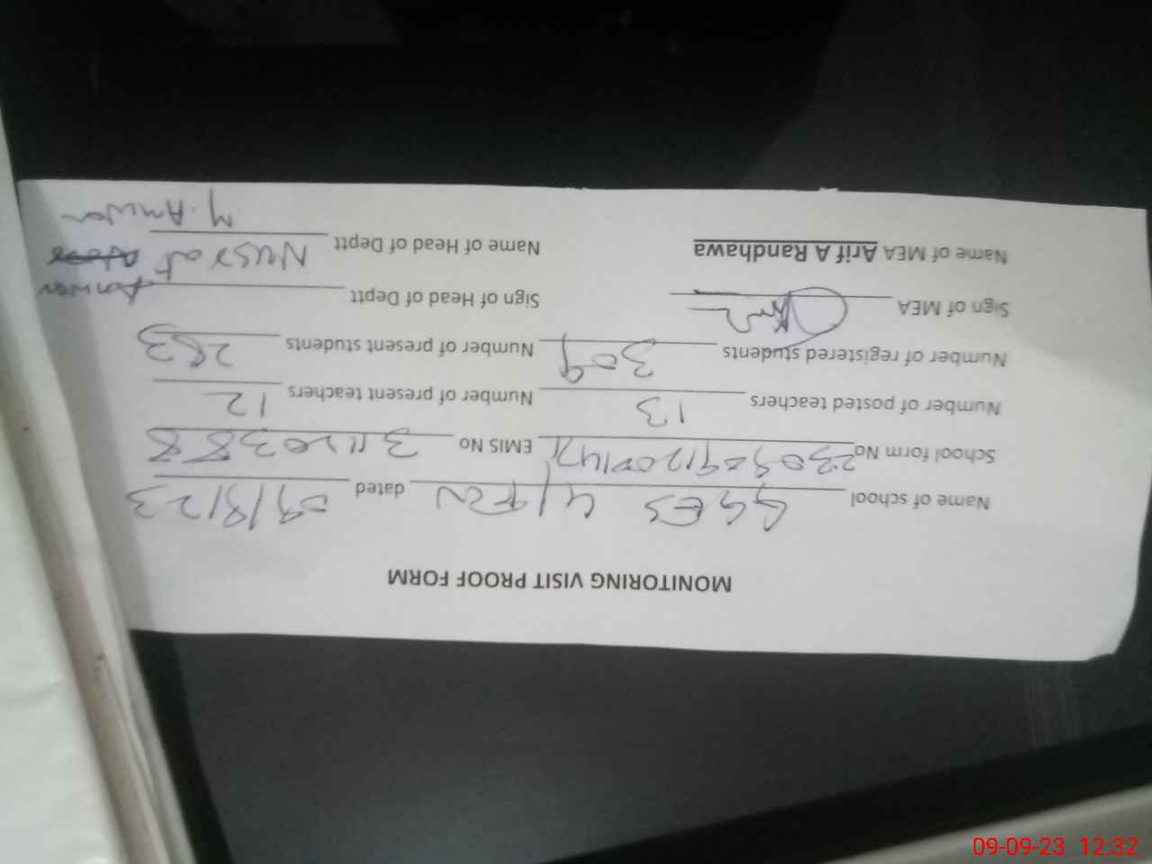 | Attendance Register | Head Teacher | MEA with School | Visit Proof |