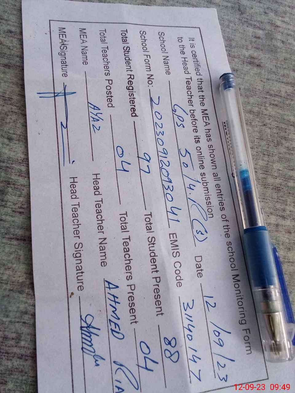 | Attendance Register | Head Teacher | MEA with School | Visit Proof |