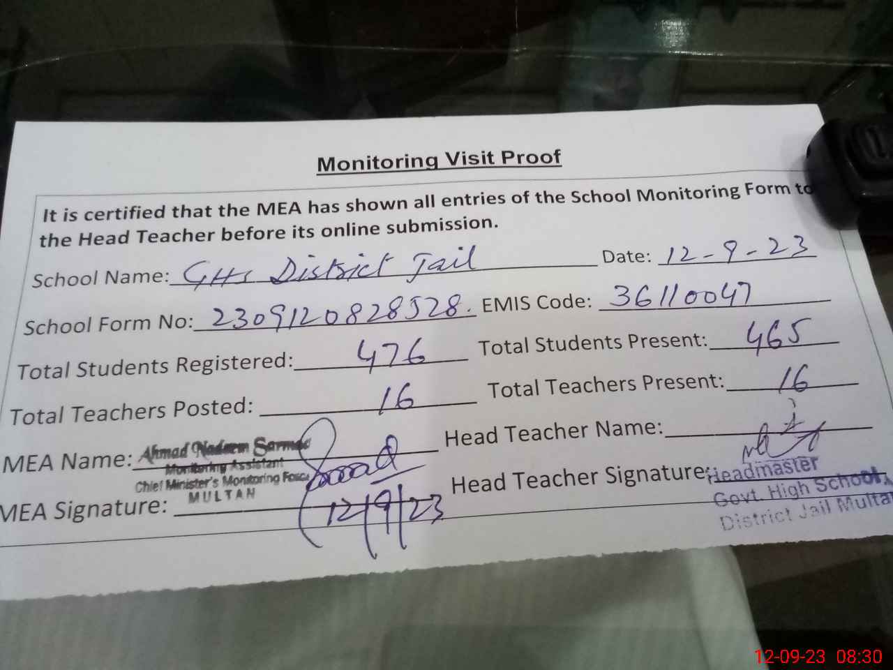 | EMIS Code: 36110047 | Name of School: GHS DISTRICT JAIL MULTAN | |||