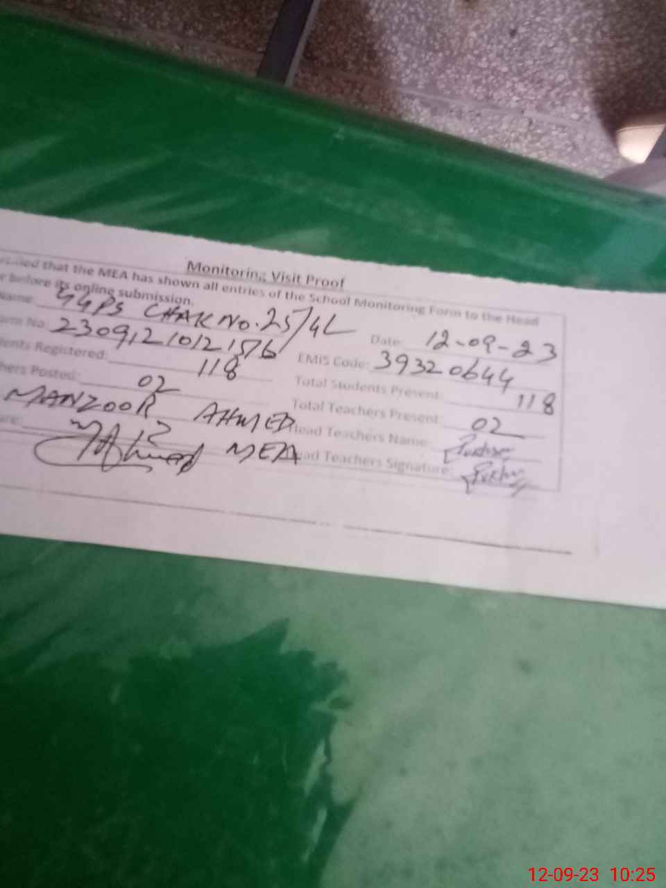 | Attendance Register | Head Teacher | MEA with School | Visit Proof |