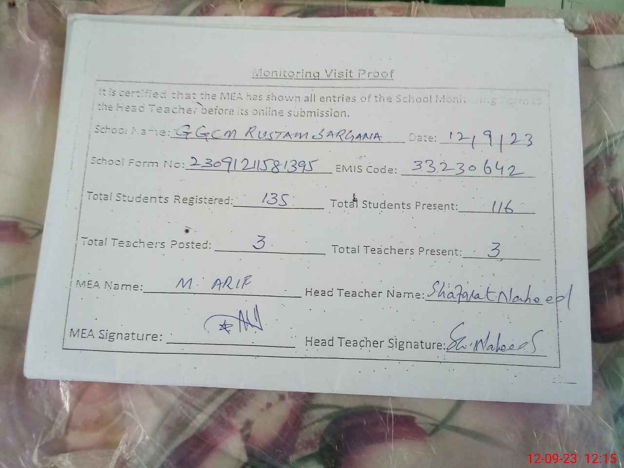 | EMIS Code: 33230642 | Name of School: GGCMS RUSTAM SARGANA NO 1 | |||
