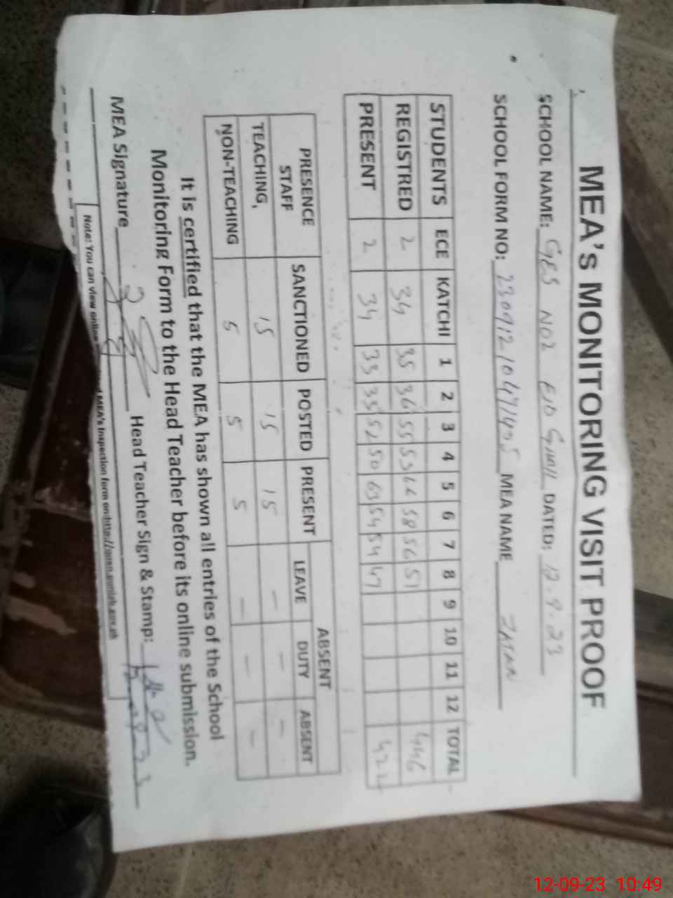 | Attendance Register | Head Teacher | MEA with School | Visit Proof |