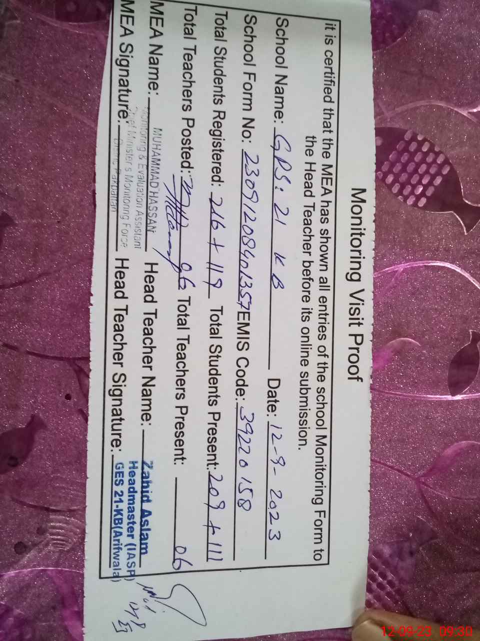 | EMIS Code: 39220158 | Name of School: GPS CHAK NO. 21 KB | |||