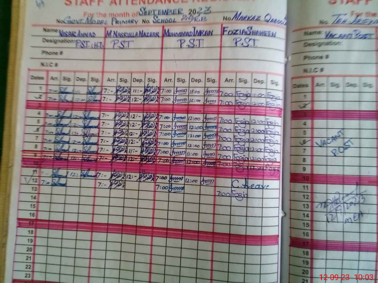 | Name: FO**** SH**** Designation: (School Headmaster's/Headmistress's) PST Phone/Cell Number: 03**** |