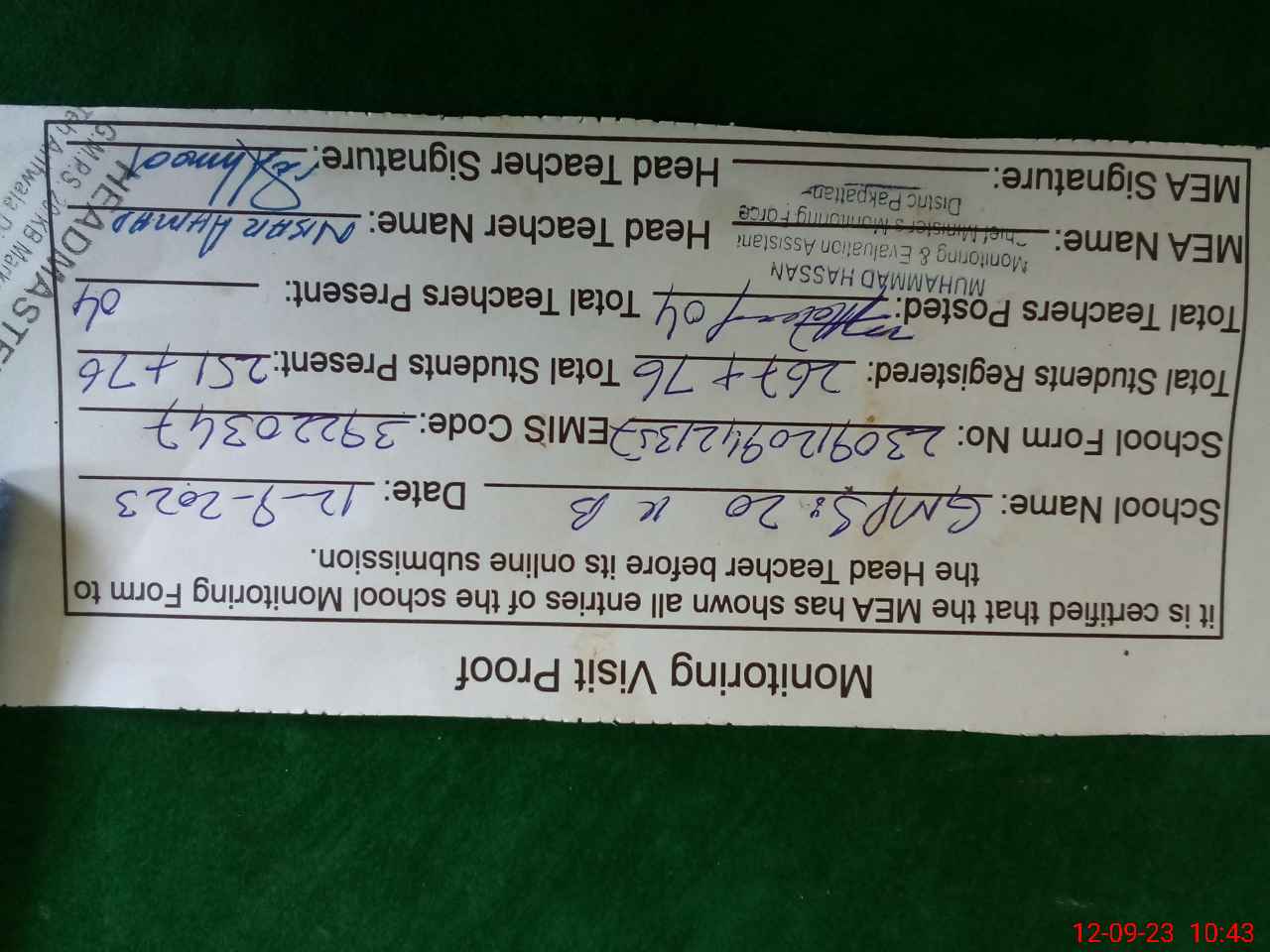 | Certified that this School was Inspected by the Undersigned MEA/DMO Today and the Information Stated Above is as Per Record. | |||||