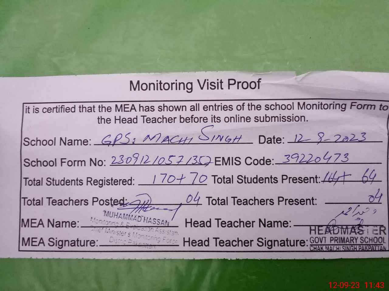 | Attendance Register | Head Teacher | MEA with School | Visit Proof |
