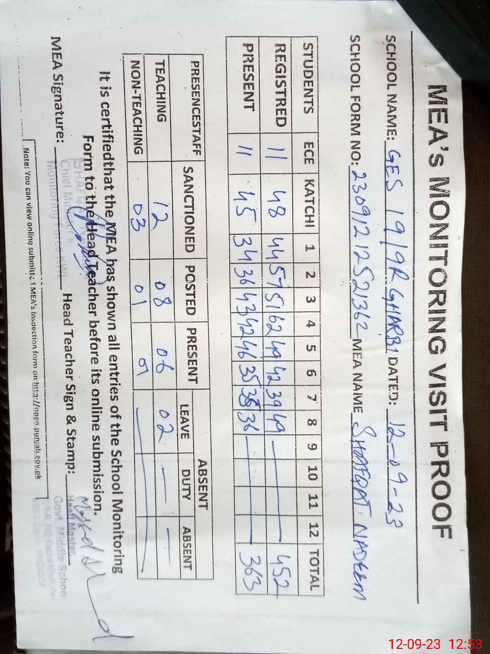 | Attendance Register | Head Teacher | MEA with School | Visit Proof |