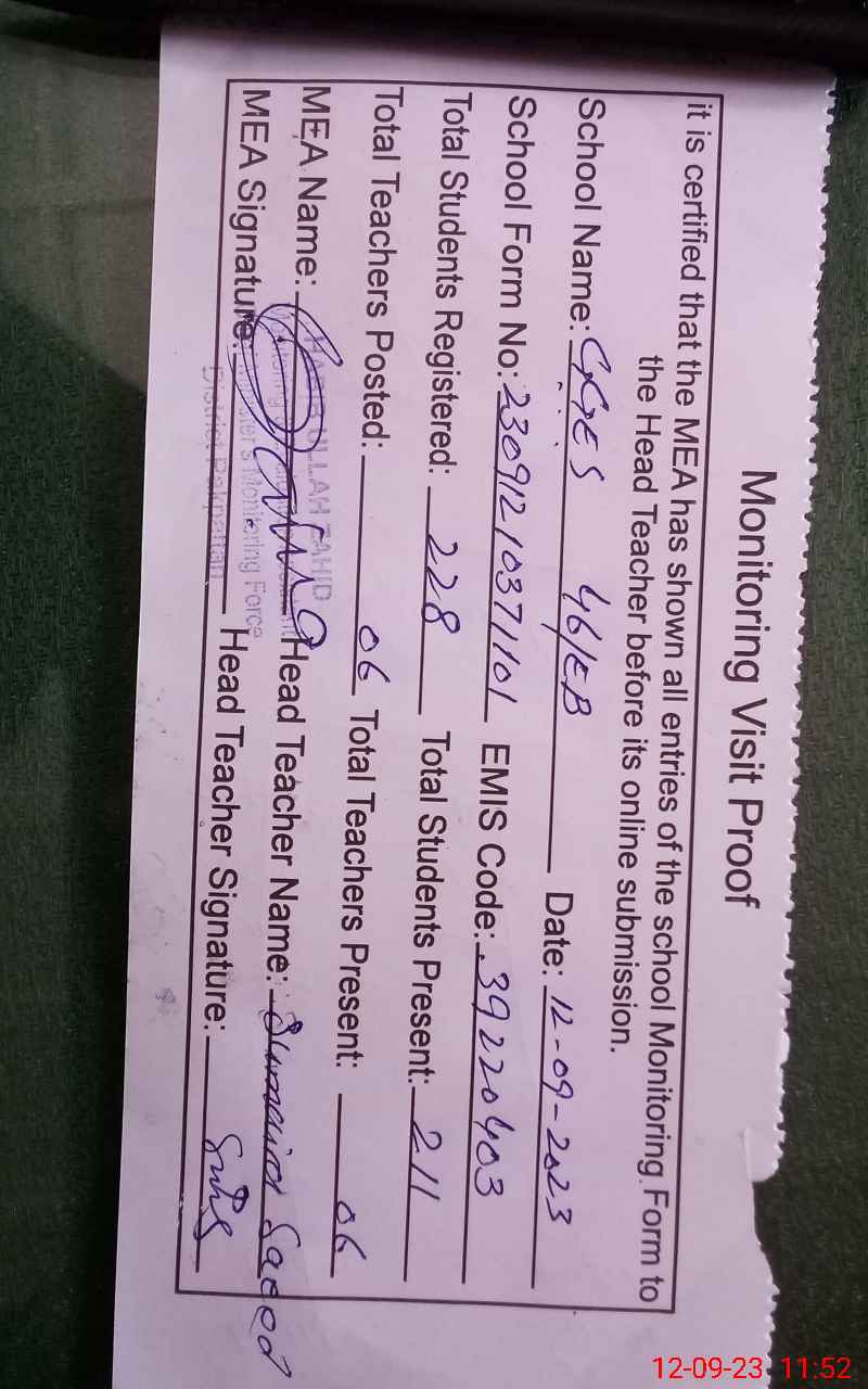| Certified that this School was Inspected by the Undersigned MEA/DMO Today and the Information Stated Above is as Per Record. | |||||