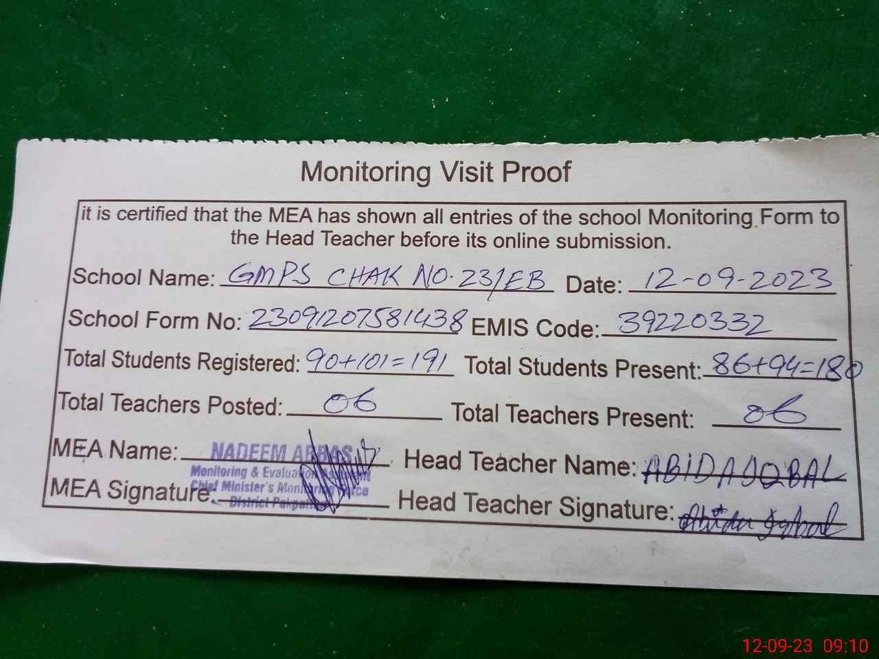 | EMIS Code: 39220332 | Name of School: GMPS CHAK NO. 23 EB | |||