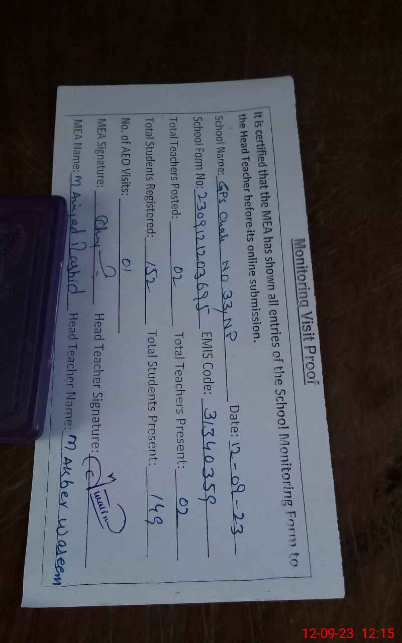| EMIS Code: 31340359 | Name of School: GPS CHAK NO 33 NP | |||